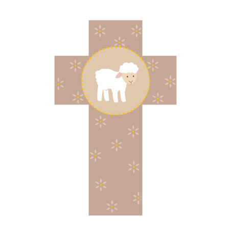 Belle croix d'enfant à la douce couleur beige rosée, ornée de petites croix et points dorés, peinte sur bois de façon artisanale.