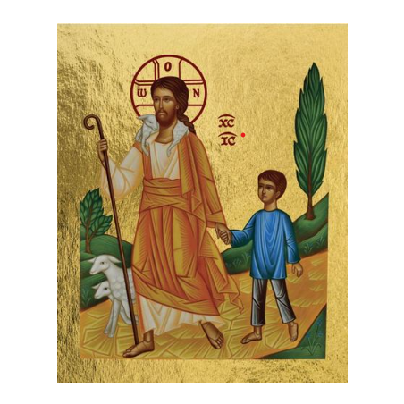 Jésus ouvre le chemin, son pas est ferme. Il regarde vers l'avenir et entraîne le petit garçon à sa suite. Voici l'icône par excellence de la confiance en Dieu.